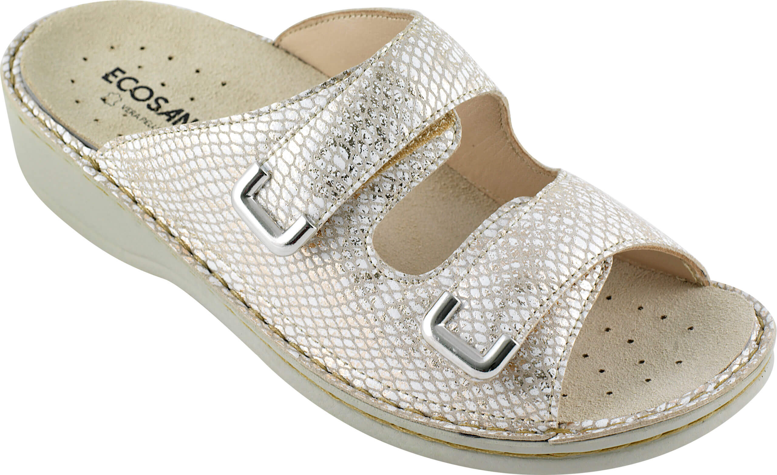 Suola: tutte le suole Ecosanit sono progettate per essere mantenute morbide, flessibili e leggere. I fori presenti sulla zona calcaneare garantiscono l’assorbimento dell’onda d’urto sul tallone e la forma è stata studiata per far alloggiare avampiede e dita senza costrizioni. Le suole Ecosanit sono inoltre 100% biodegradabili, in quanto prodotte con poliuretano senza CFC e propellenti naturali come l’acqua. Certificazione CE: tutti i componenti della calzatura sono stati sottoposti a procedimenti e prove di collaudo, quali la resistenza allo strappo, la permeabilità al vapore d’acqua, coefficiente del vapore d’acqua, valore di Ph: per tomaia e fodera, valore di Ph e assorbimento d’acqua e deassorbimento d’acqua: per plantare e sottopiede. Resistenza allo strappo, resistenza alla flessione: per la suola.
